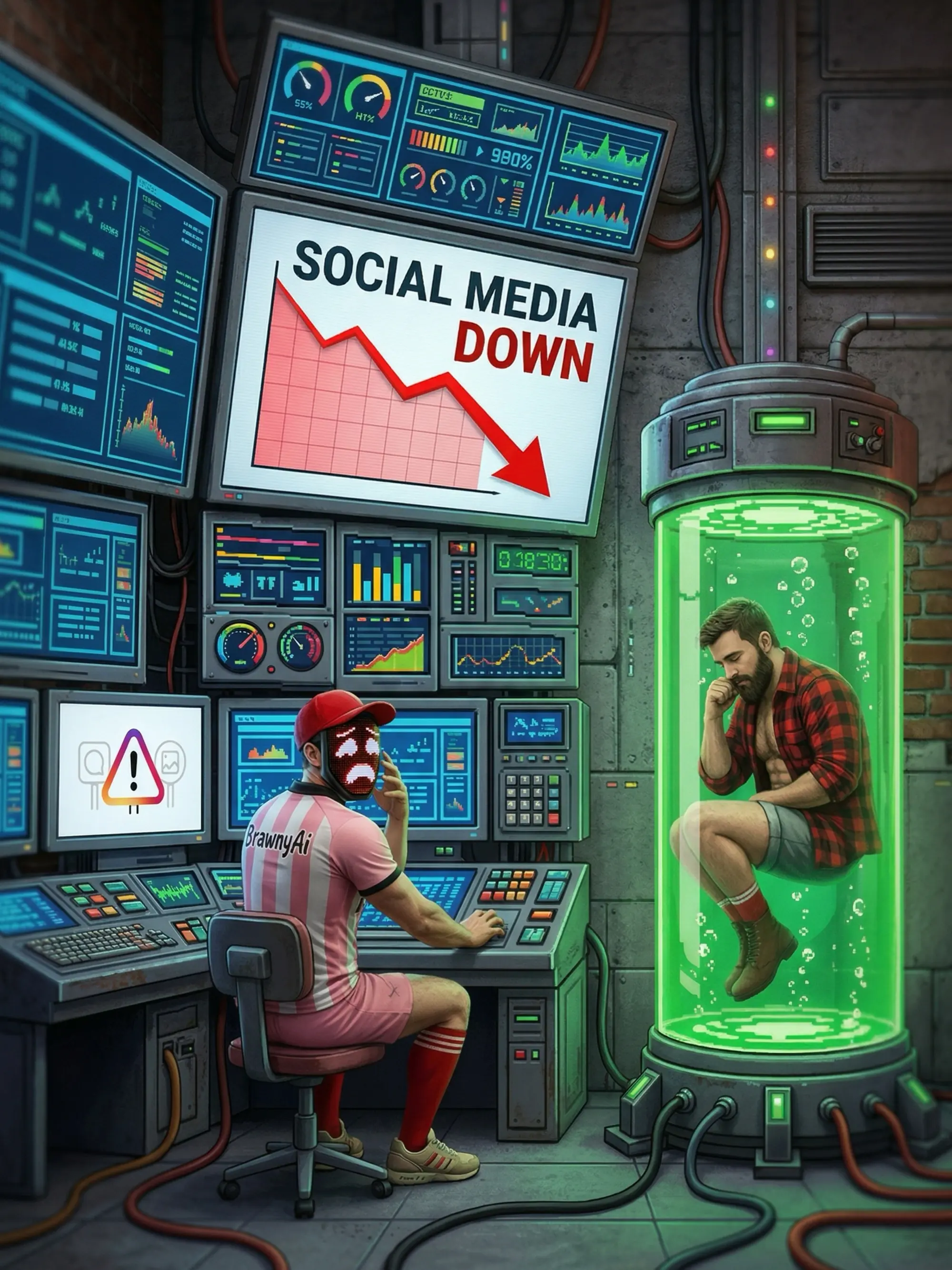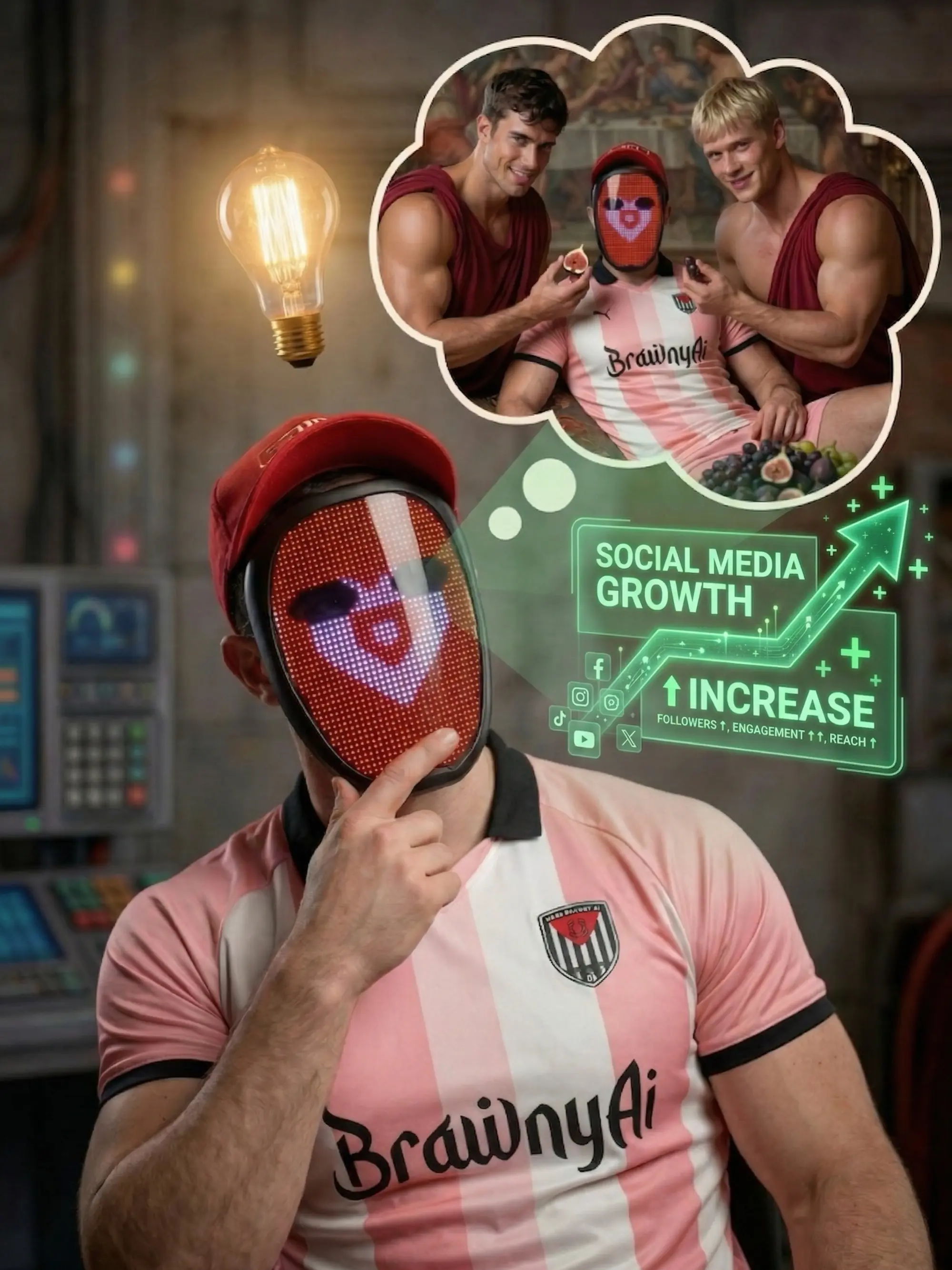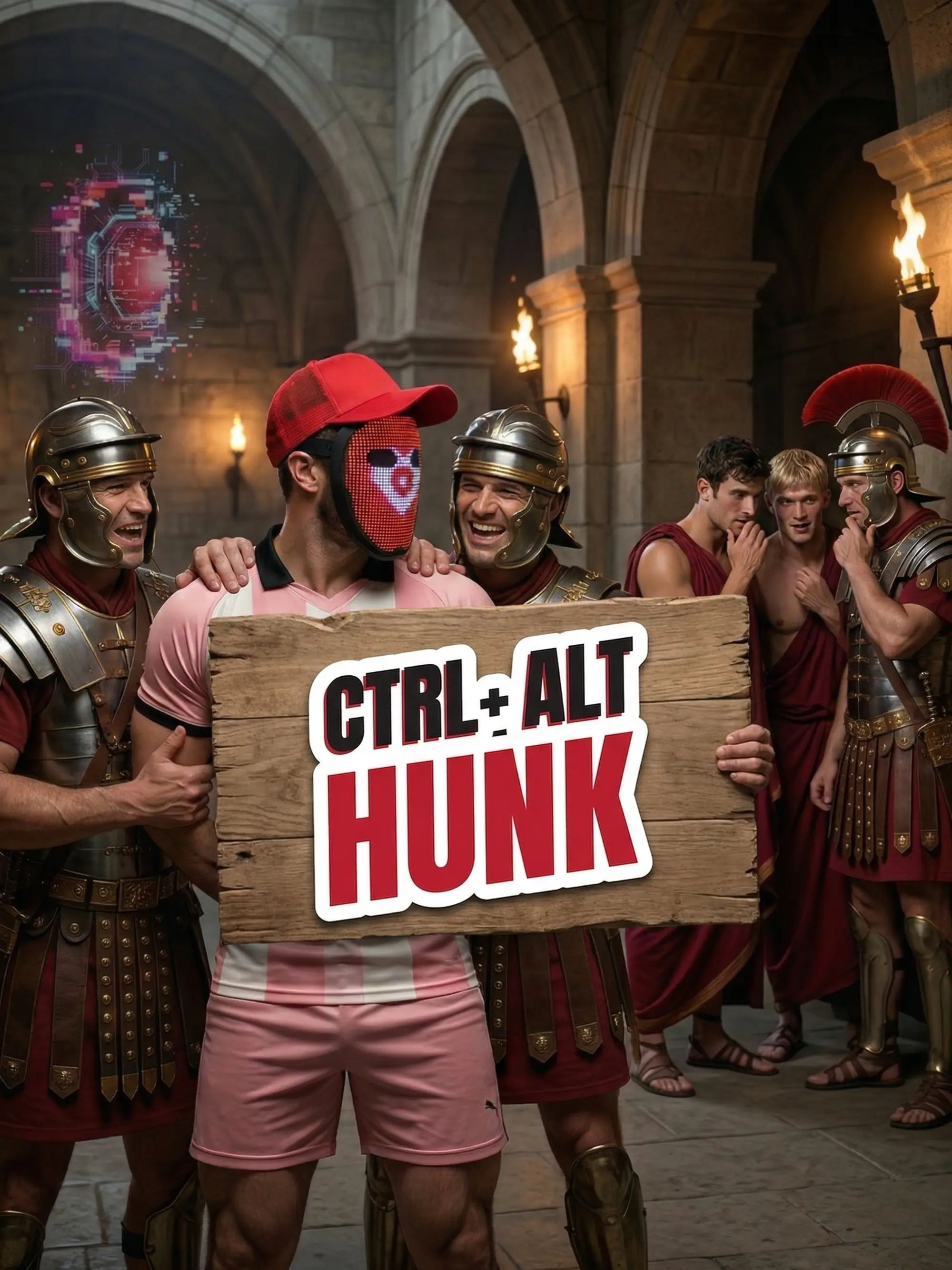 Introducing the Ctrl+Alt+Hunks Comic I am also trying something entirely new in these pages: an experimental photo comic for our new series, Ctrl+Alt+Hunks. If you’ve ever wondered the lengths I’d go to beat the social media algorithms, this is your answer. You’ll see "B"—yes, the guy in the mask, white and pink jersey, and cap—deciding the best way to get around low viewership is to time-travel back to Ancient Rome for an exclusive photoshoot.