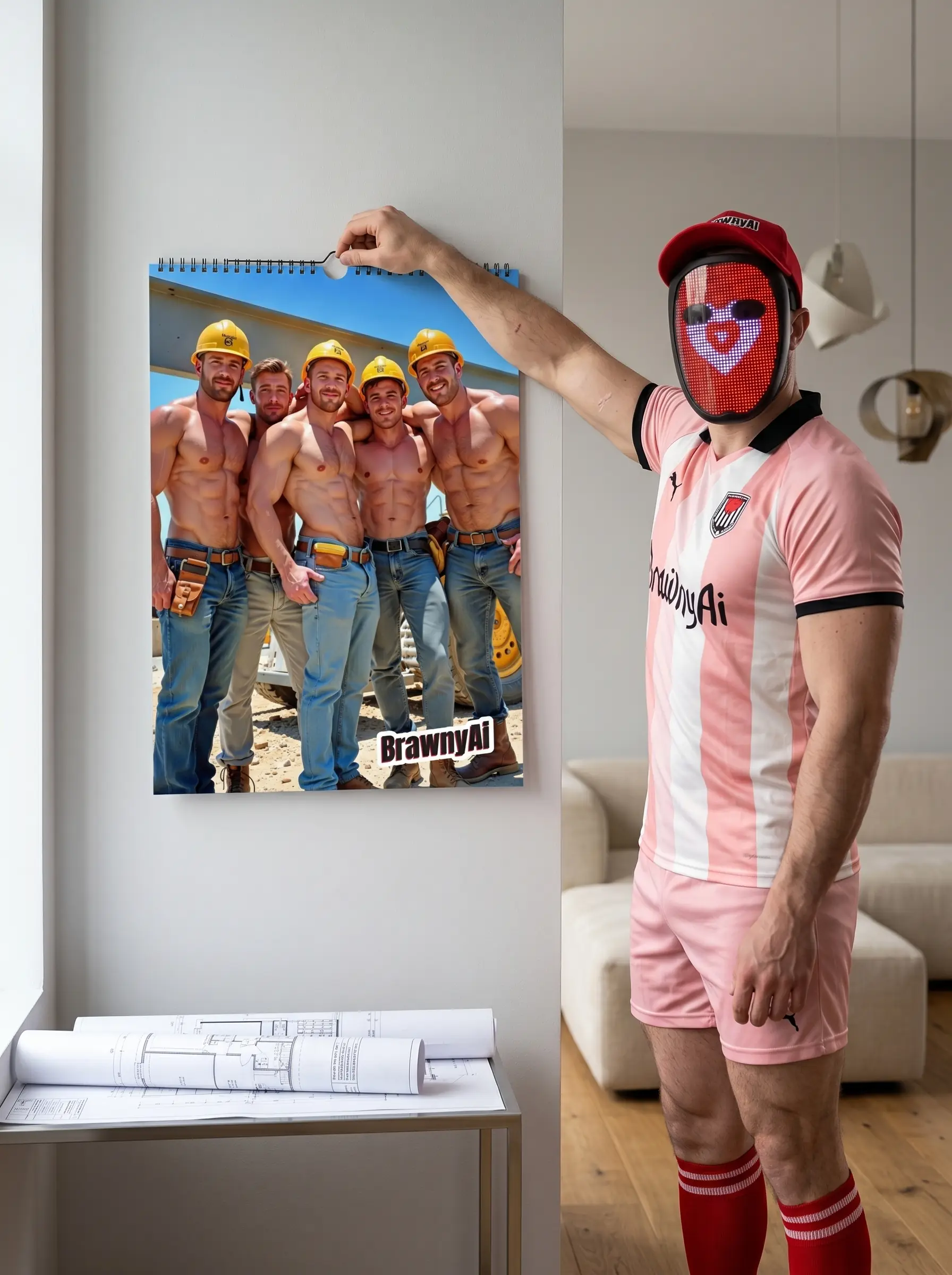The visuals in PlayHunks Edition 3 are some of my absolute favorites. You will catch our muscular crew laughing together while reviewing building blueprints. You will also spot me wearing a glowing LED mask with a pink BrawnyAi jersey standing next to a massive worker holding a hand saw. We captured some amazing moments of the guys cooling down with a refreshing bottle of PlayHunks Sweat. We even included a fun nostalgic nod to our AI roots with an image of the crew packed into a retro computer lab. The guys are shirtless in their hard hats while typing away at their heavy monitors. Another great shot features a flat lay of a rugged worker surrounded by his leather tool belt boots and measuring tape. It is a perfect tribute to the grit and muscle of the trade.
