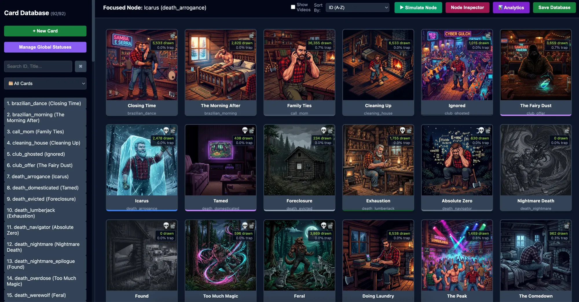 Because non-linear storytelling is incredibly complex, I built a Card Database tool. It visualizes the branching logic of the game to prevent dead ends. I even integrated a Monte Carlo simulation engine that runs thousands of simulated playthroughs in seconds to balance the gameplay before it ever reaches your screen.