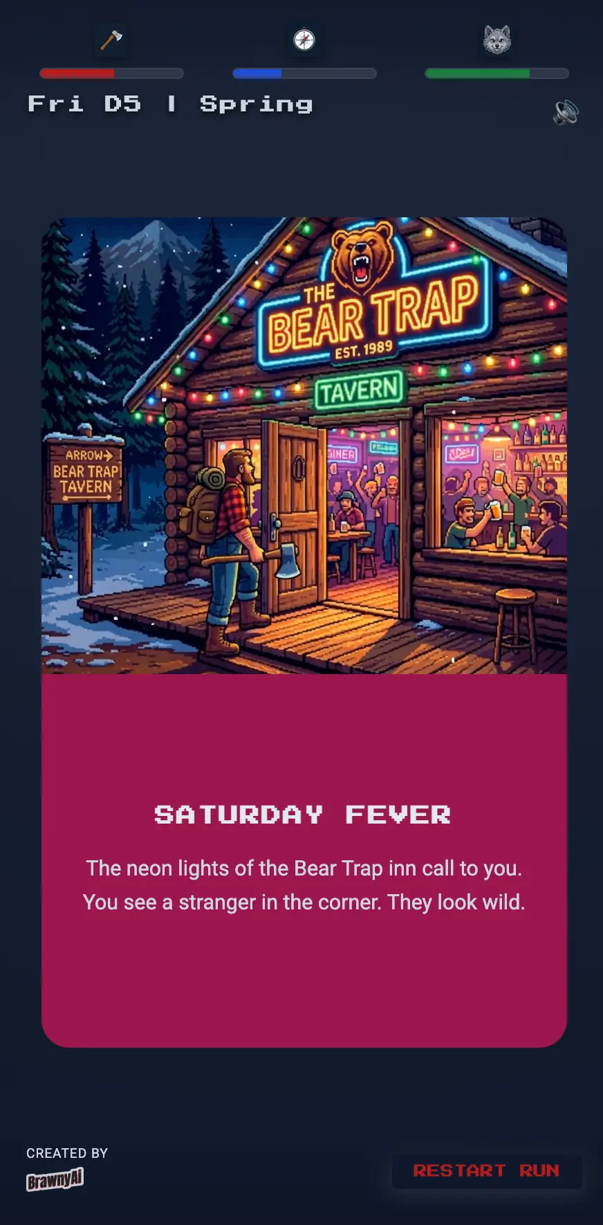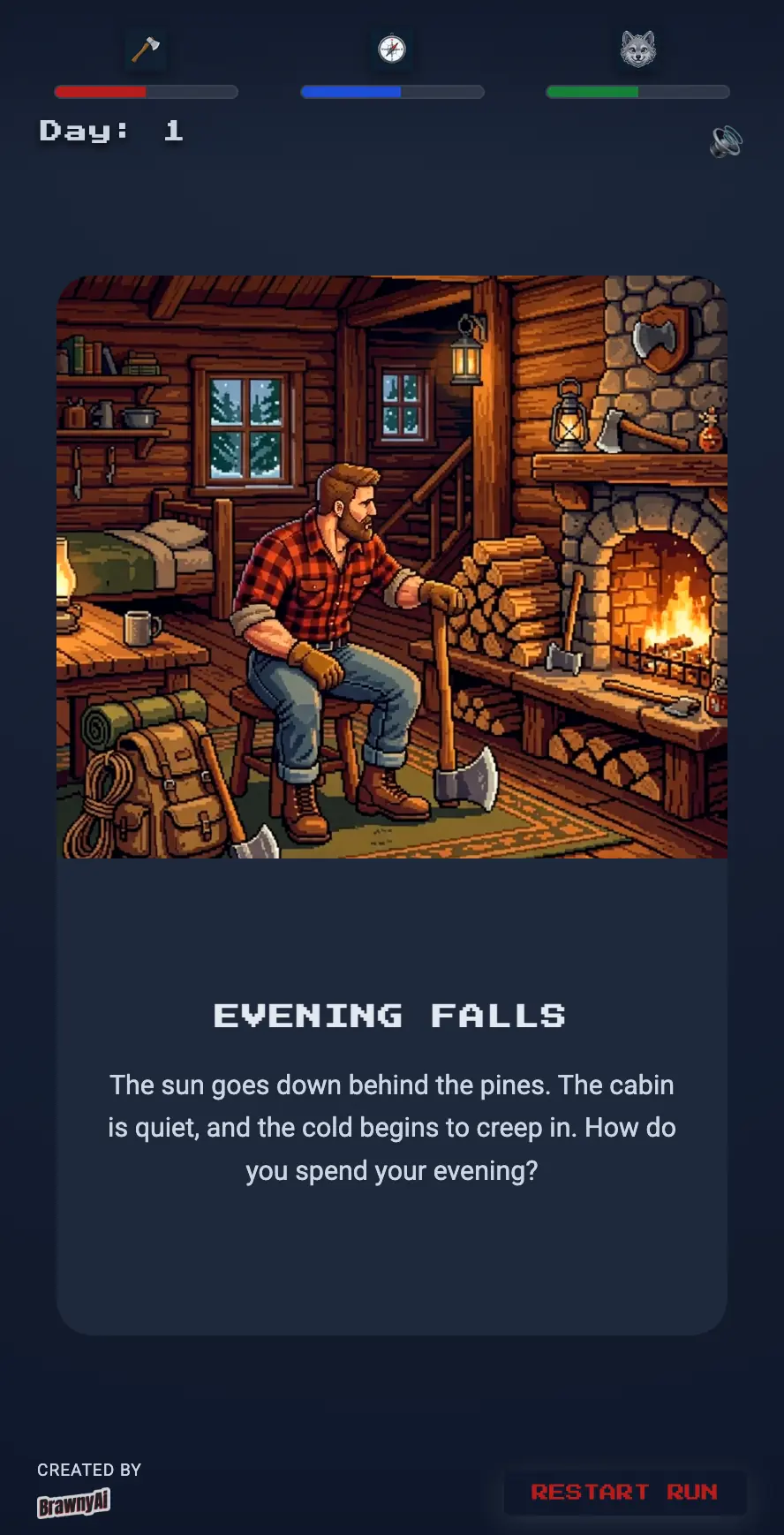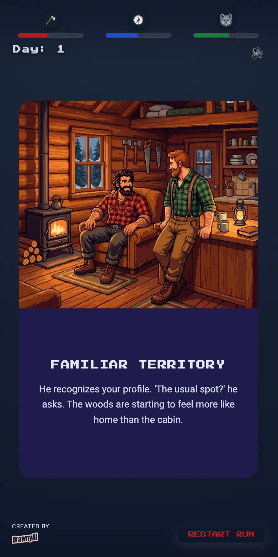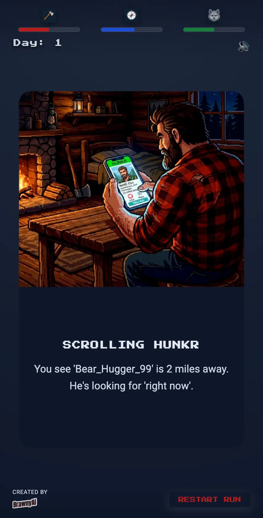 I am currently developing a swipe-based survival RPG (working title: Lumberjack RPG). You step into the boots of a Lumberjack, making daily choices that affect your strength, your wildness, and your relationships on the "Hunker" app.