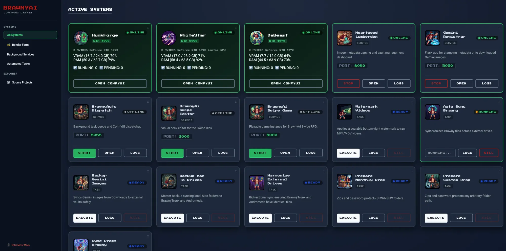 This is the literal brain of the operation. As the infrastructure grew, I needed a god-mode view of my entire hardware and software ecosystem. I coded the Command Center to monitor my rendering machines (HunkForge, WhiteStar, DaBeast) in real-time. From this single dashboard, I can start and stop background services, launch local UI instances, and execute heavy automated tasks like bulk watermarking and bi-directional cloud syncing. It turns chaos into absolute control.