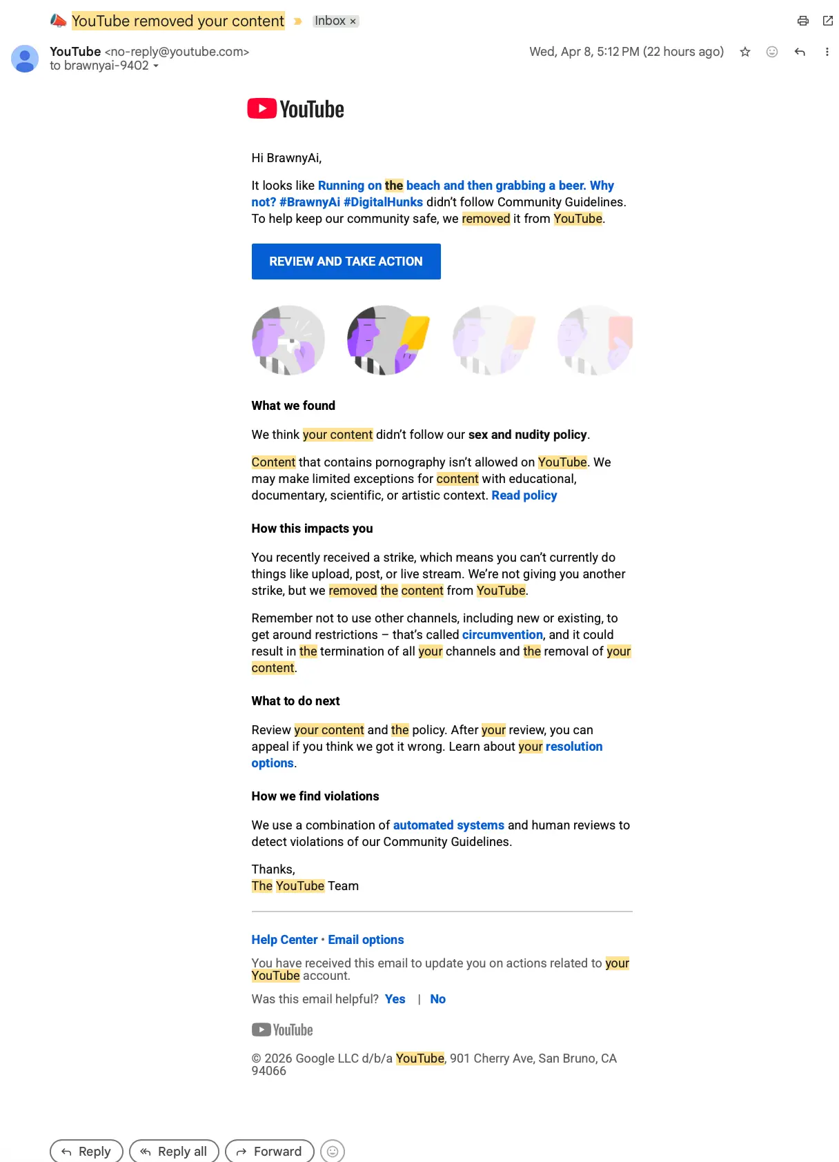 A few weeks ago, the BrawnyAi YouTube channel—which has grown to almost 70,000 followers—was on the absolute brink of being permanently deleted. Out of nowhere, the automated systems began flagging our content. I received strikes for videos that simply featured our guys fully dressed in red plaid shirts and jeans, which the platform inexplicably categorized as explicit pornography.